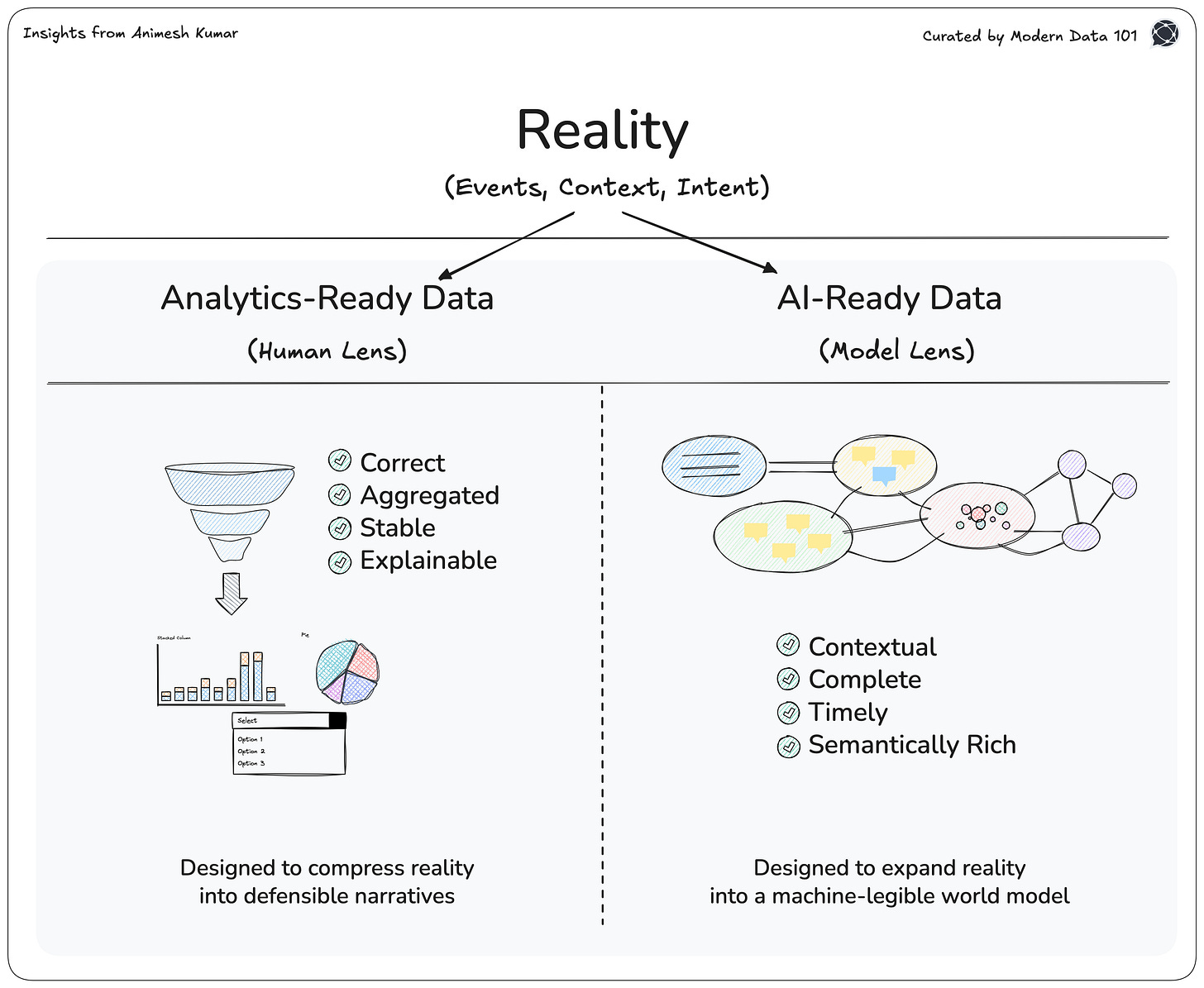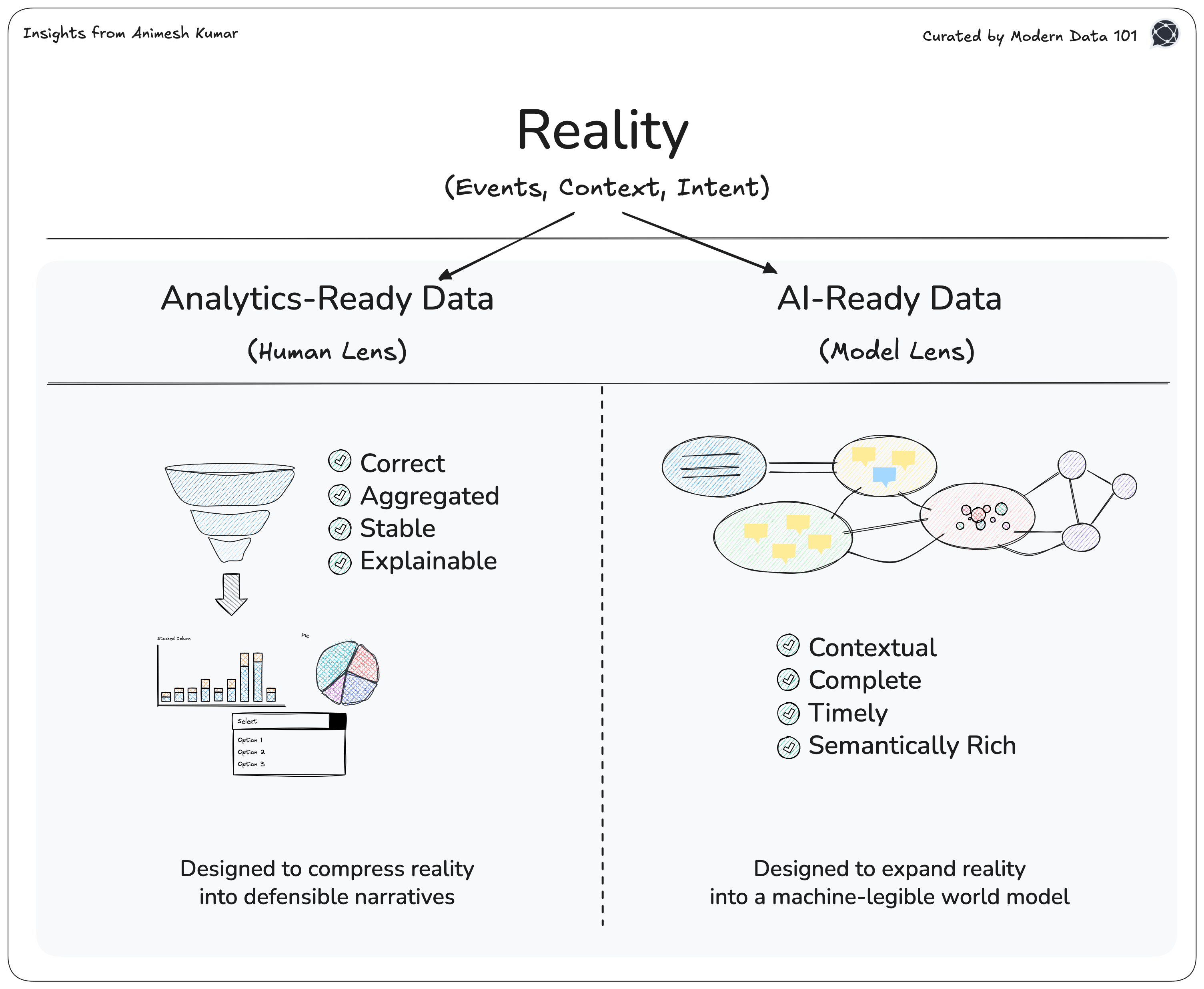 Analytics-ready data is a by-product of human decision systems. It is shaped after the fact, optimised to explain outcomes, justify choices, and create alignment. AI-ready data, on the other hand, is raw material for reasoning systems. It exists before conclusions are drawn, not after they are summarised.