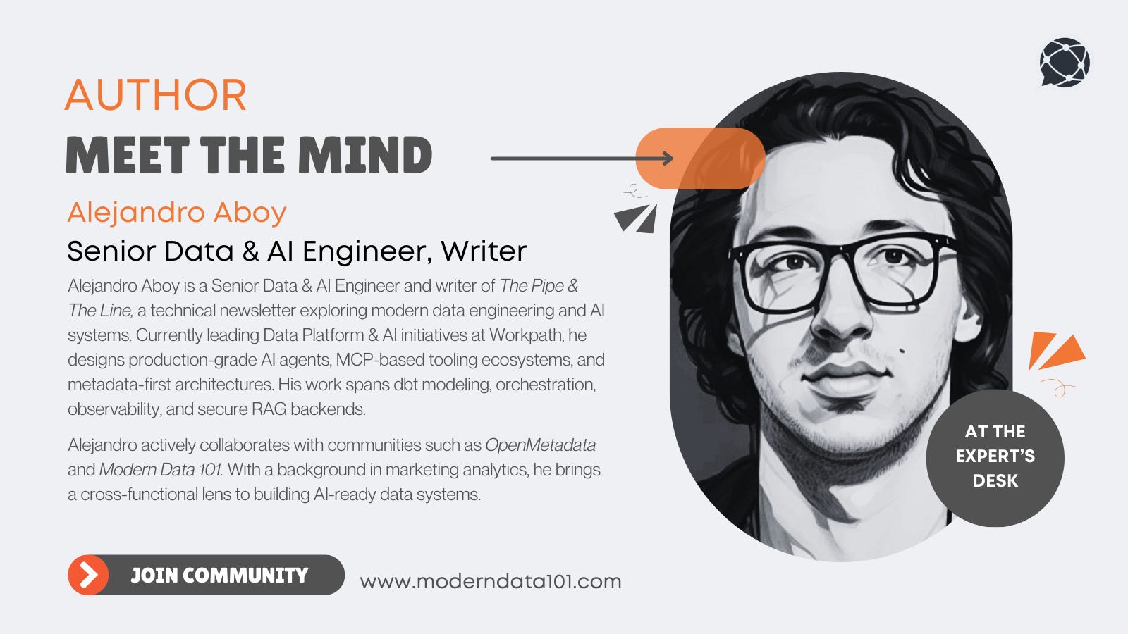 Alejandro is deeply engaged in the open data community. He has collaborated with OpenMetadata on agentic data modeling and metadata-first architectures, co-authoring end-to-end implementations that connect lineage, governance, and AI tooling through MCP. His writing is frequently featured by Modern Data 101 and other leading data publications. We’re thrilled to feature his unique insights on Modern Data 101!