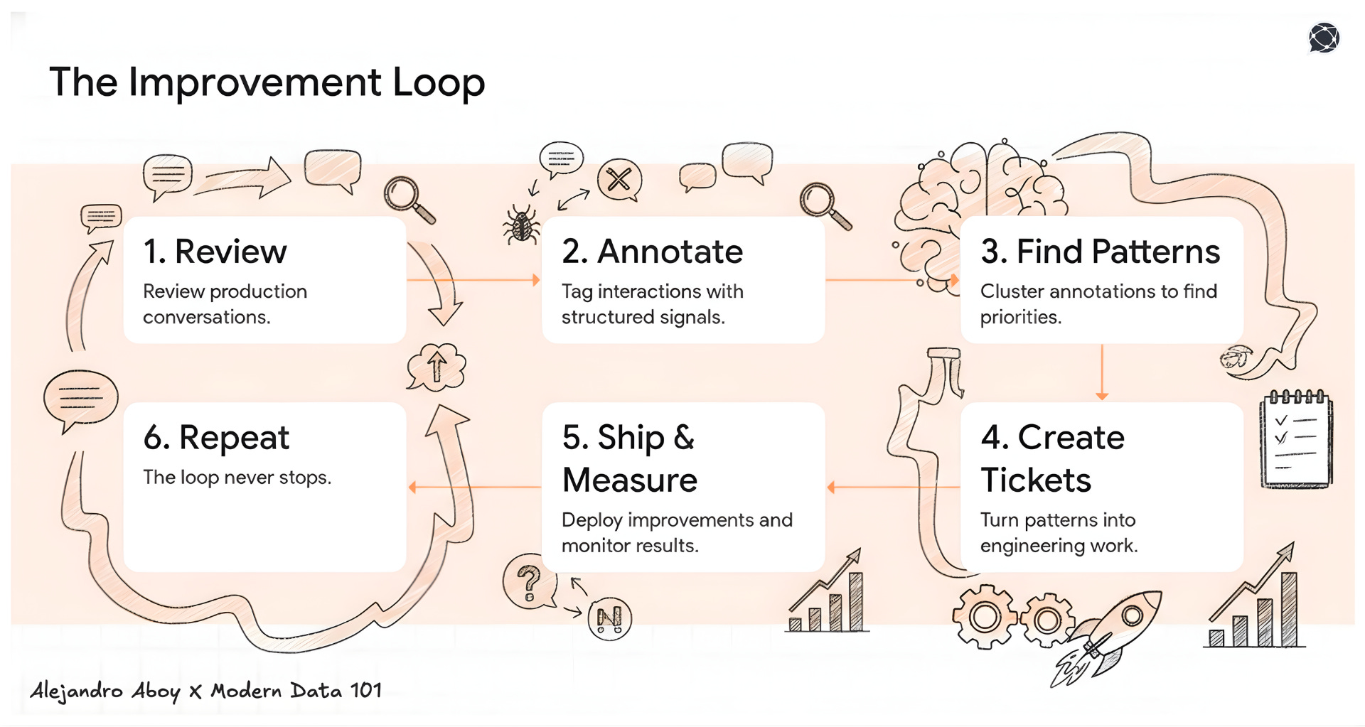 The loop: Conversations → Structured Annotation → Clustered Patterns → Tickets → Ship → Measure → Repeat