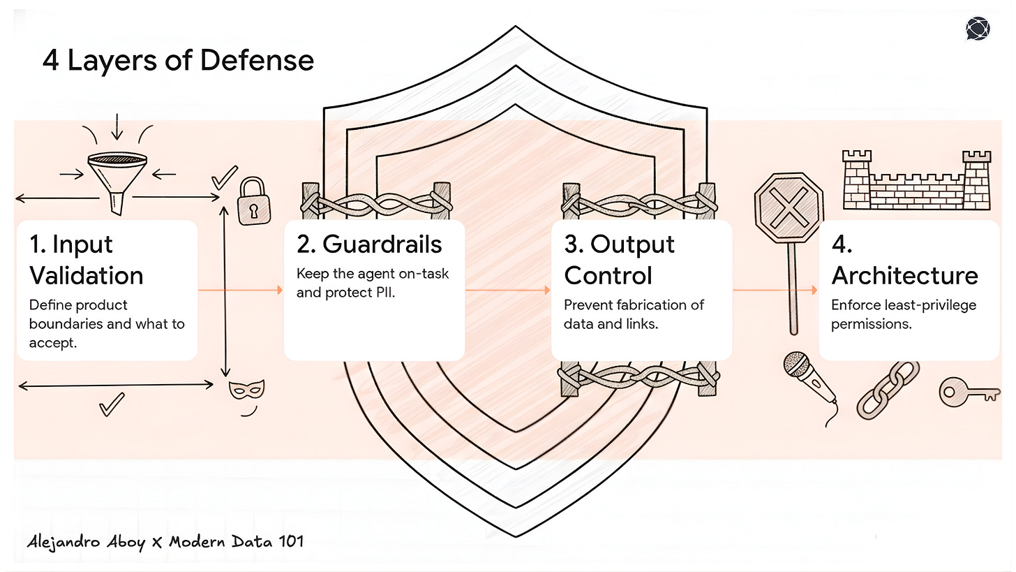 Your agent accepts natural language from anyone. That’s the largest attack surface in your product. I wrote an entire series on building jailbreak-proof AI agents, and the core idea is defense in depth across 4 layers: