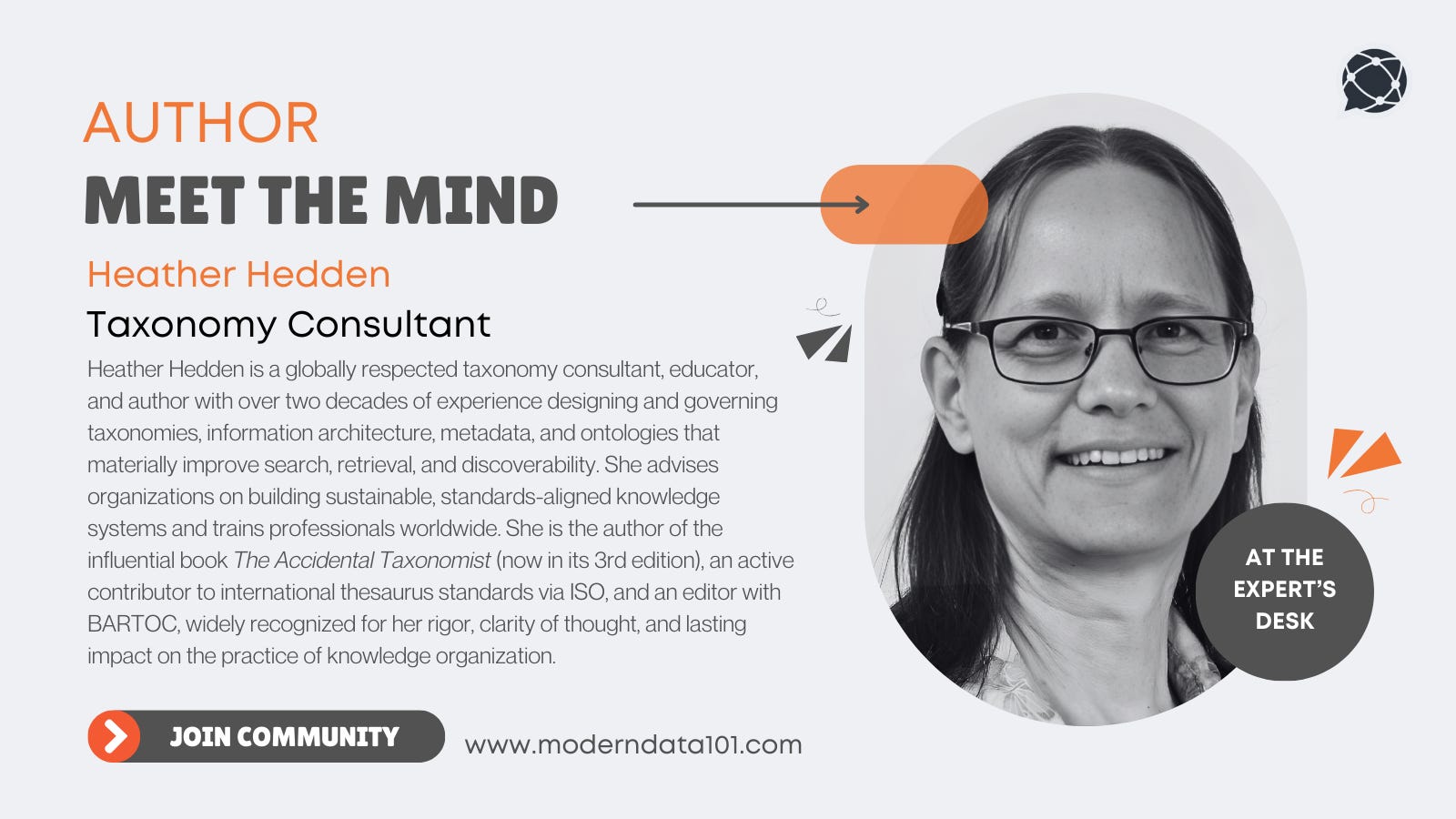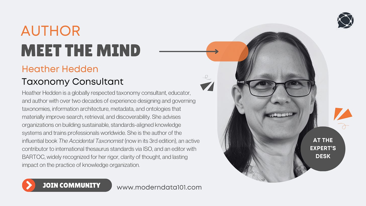 Heather advises enterprises, platforms, and institutions on building sustainable, standards-aligned taxonomy programs, while also training professionals through courses, workshops, and conferences worldwide. Her contributions extend beyond consulting into stewardship of the discipline itself, including active involvement in ISO standards for thesauri and long-standing editorial leadership with BARTOC. Known for her intellectual rigour, generosity in teaching, and unwavering commitment to quality, Heather continues to elevate the practice of knowledge organisation for the modern information economy. We’re thrilled to feature her unique insights on Modern Data 101!