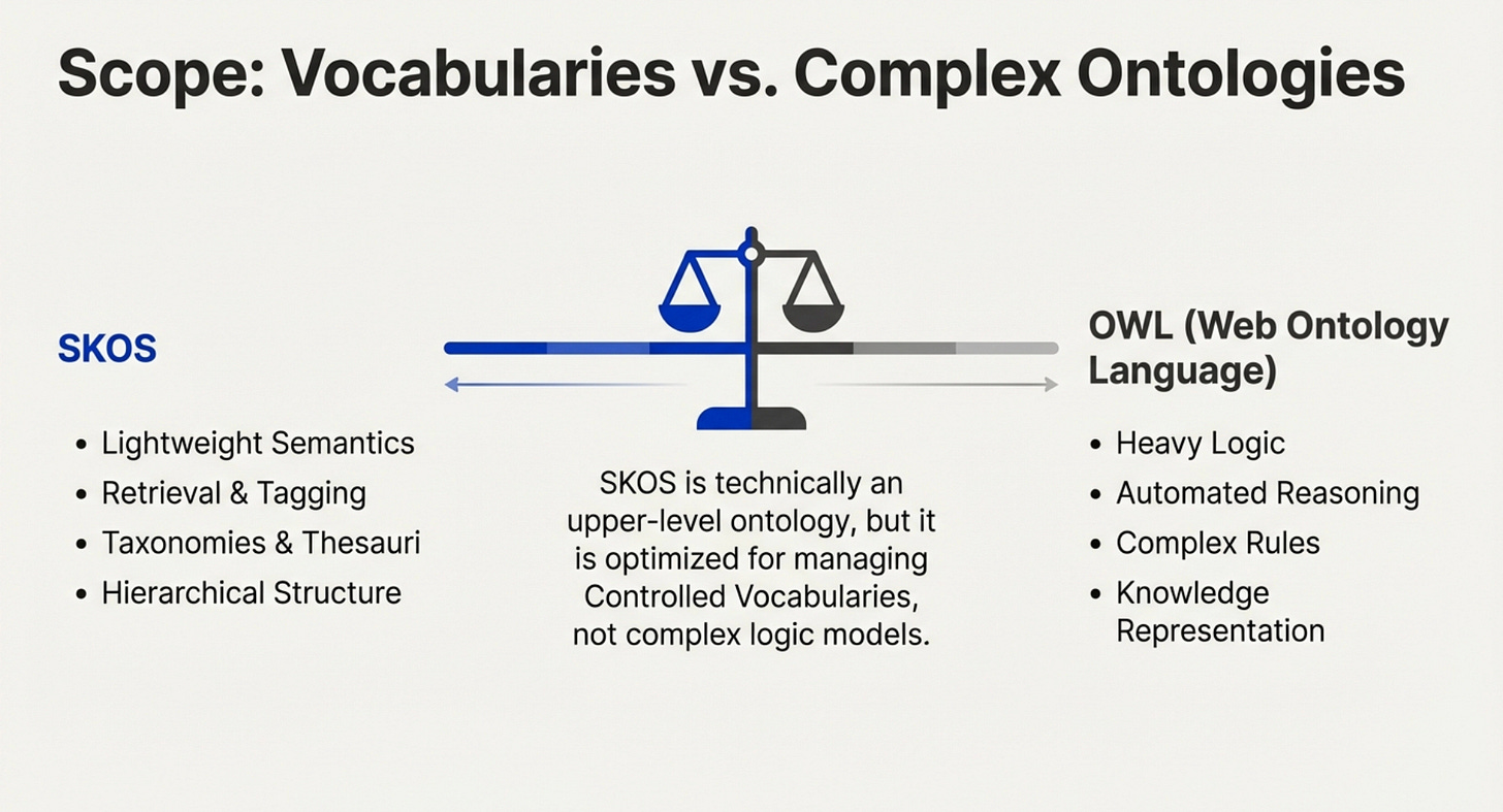 SKOS does not support all knowledge organization systems, and we usually refer to what is supported by SKOS as “vocabularies.”
