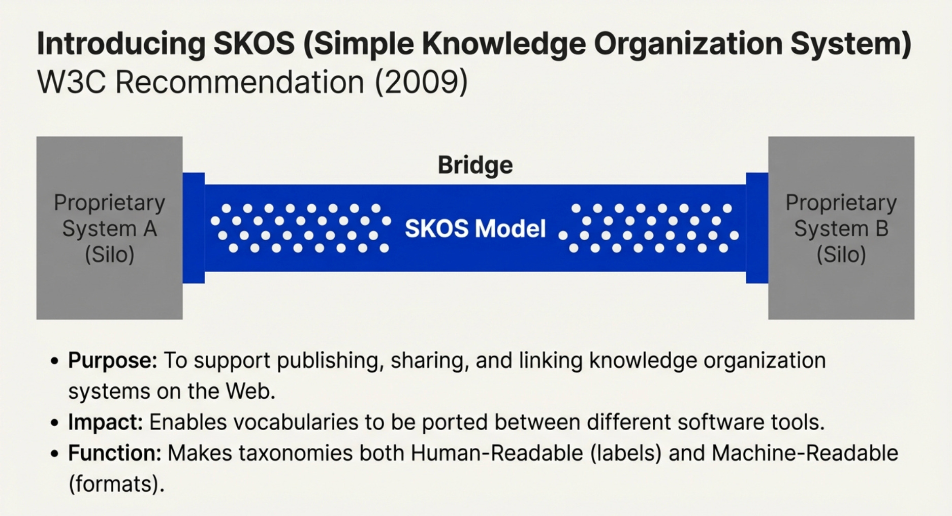 Although SKOS is often referred to as a “standard,” more precisely, it is a common data model recommended by the W3C for making knowledge organization systems both human-readable and machine-readable, in addition to being interoperable.