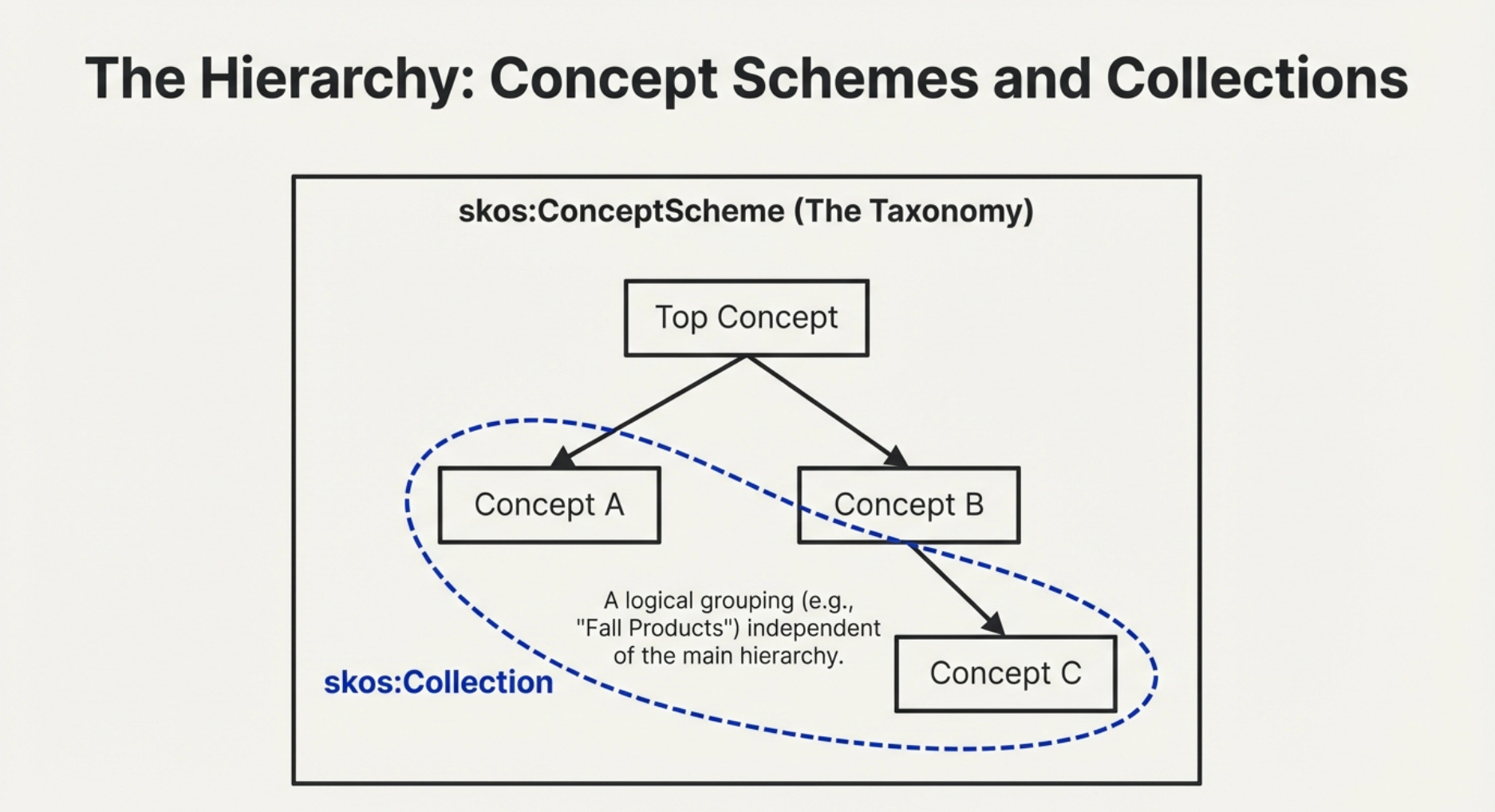 The “concept scheme” is the highest level of organization for SKOS vocabularies. A concept scheme is a collection of concepts. Concepts are arranged in hierarchical relationships of broader/narrower to each other. The relationship between the highest level of a taxonomy hierarchy and the concept scheme is instead that of “top concept”.