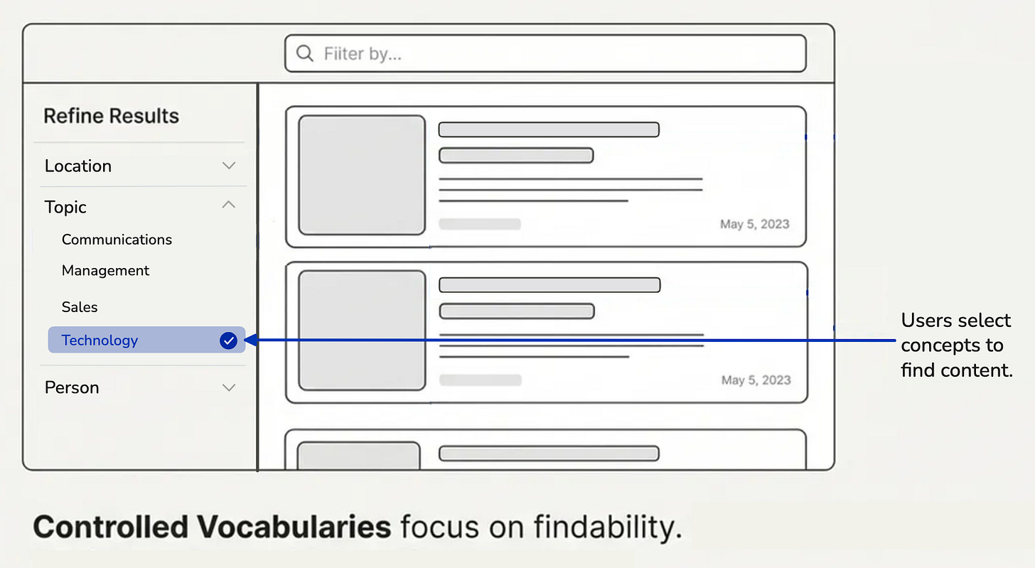 Users select a concept or category from a controlled vocabulary to retrieve the content that has been tagged with it. Controlled vocabularies exclude certain knowledge organization system types, such as dictionaries or glossaries, where the focus is on defining words.