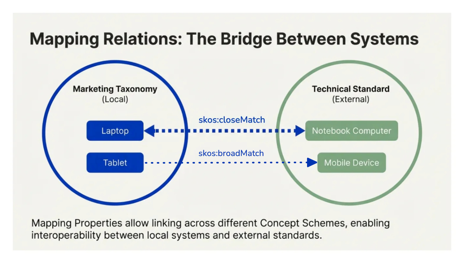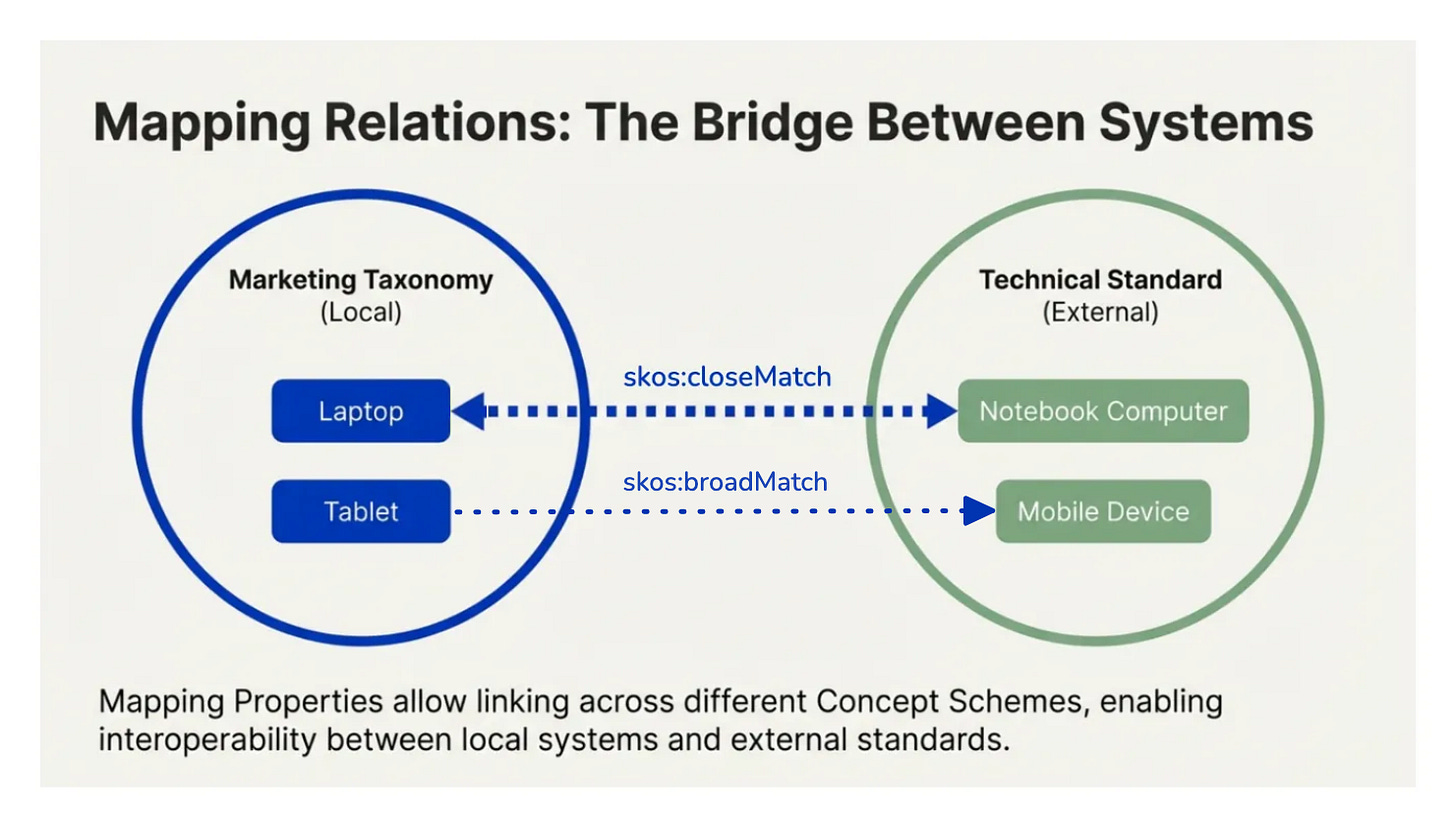 Use of SKOS mapping relations allows you to link, map, or connect taxonomies together on a concept-by-concept level. These different taxonomies may be on your local server, or they may be external but linked on the web with URLs.