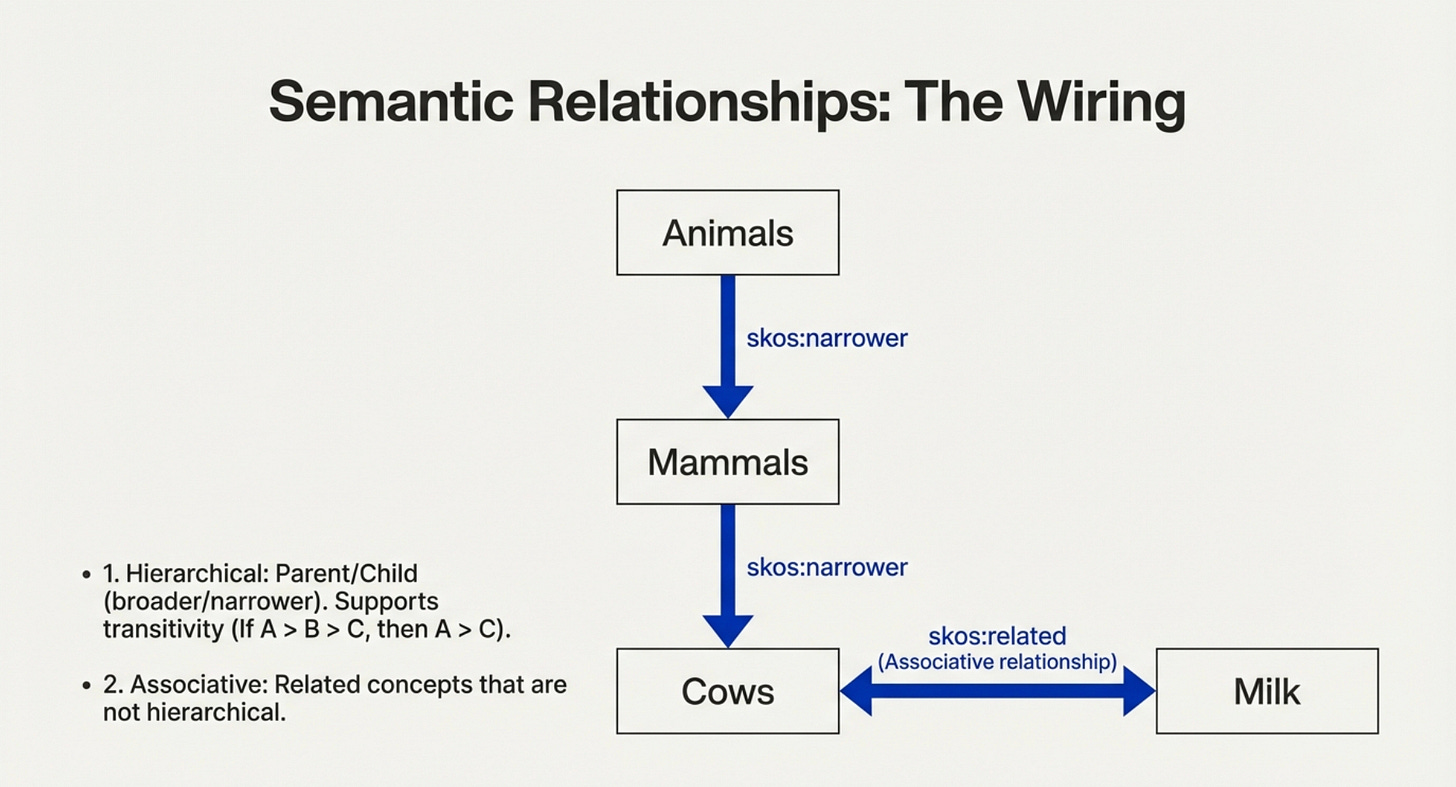 The relationships available between concepts are (1) hierarchical, involving the inverse pair of “broader” and “narrower,” and (2) associative, involving the reciprocal relationship of “related.”