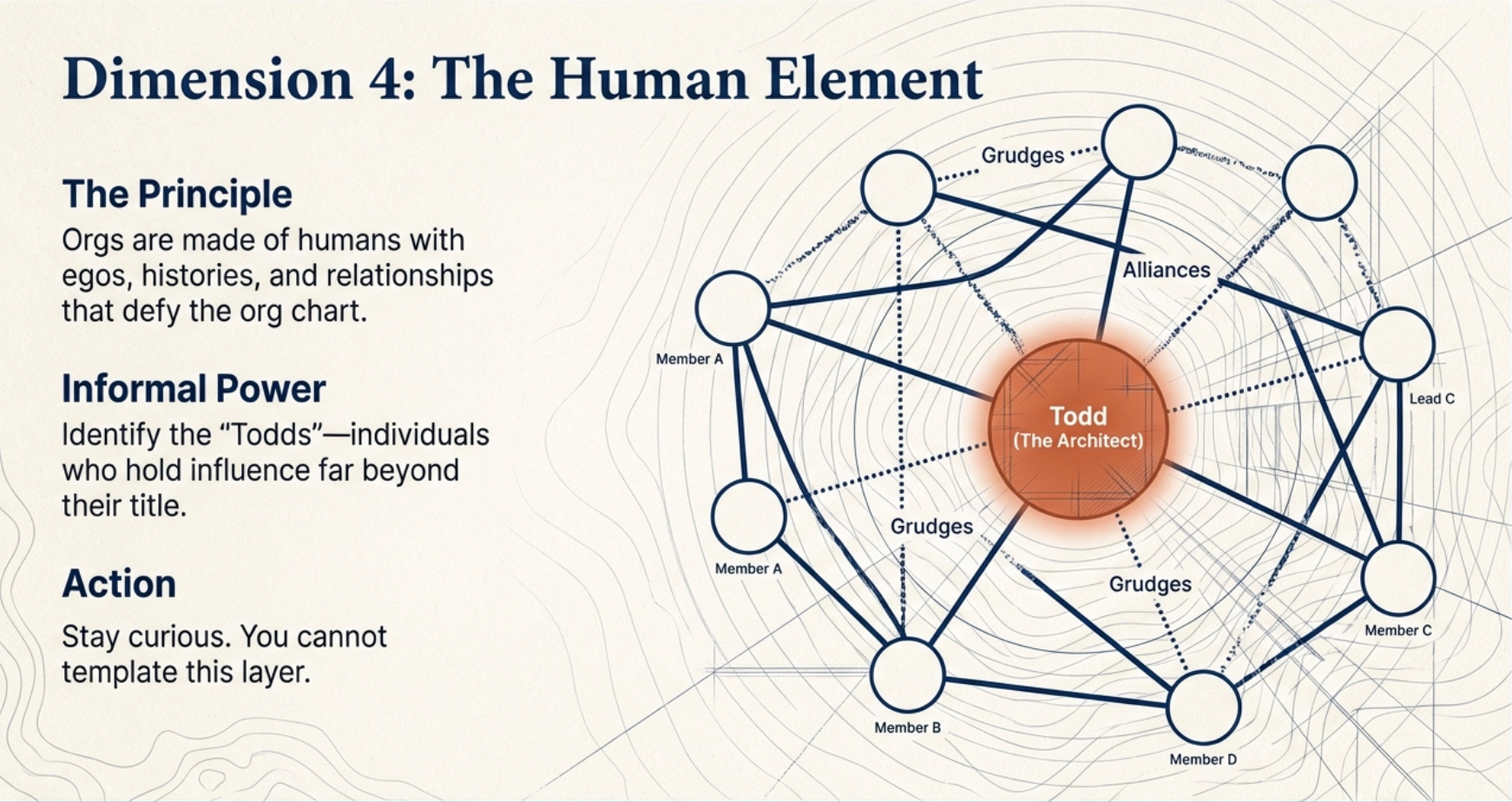 You can’t template this layer. What you can do is stay curious. Pay attention to who holds informal power, which relationships are strained, and where past conflicts still echo.