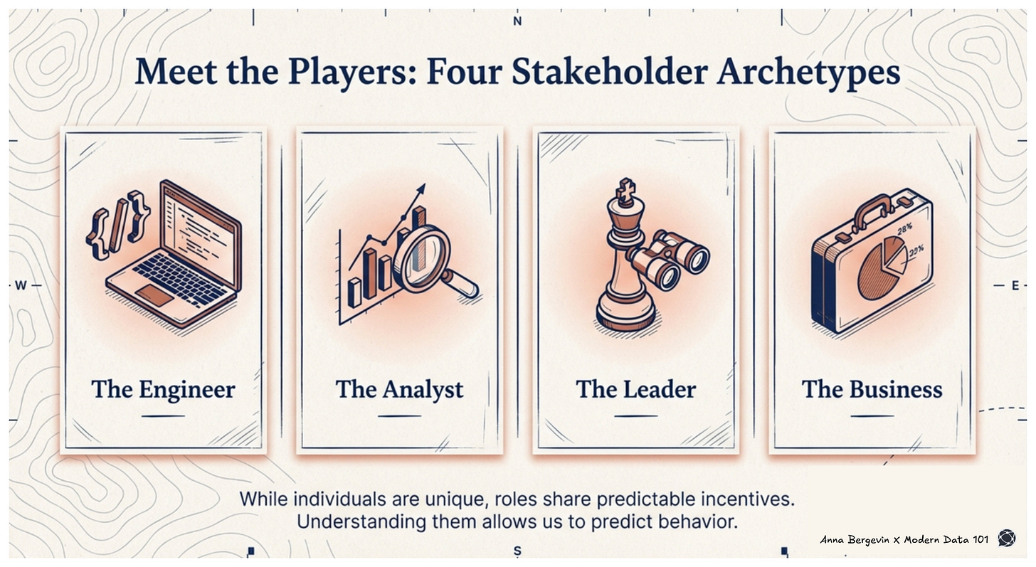 While every individual is unique, I have found that certain roles share predictable incentives, constraints, and pain points that shape how they operate. The four stakeholder archetypes below will help you interpret the behavior of your colleagues: what they optimize for, what drains them, and what they commonly misunderstand about each other.