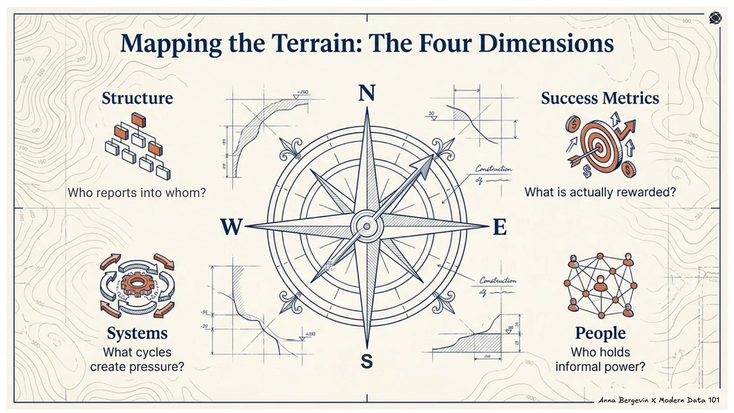 Building this map? That requires systematic observation across four dimensions: structure, success metrics, systems, and people.