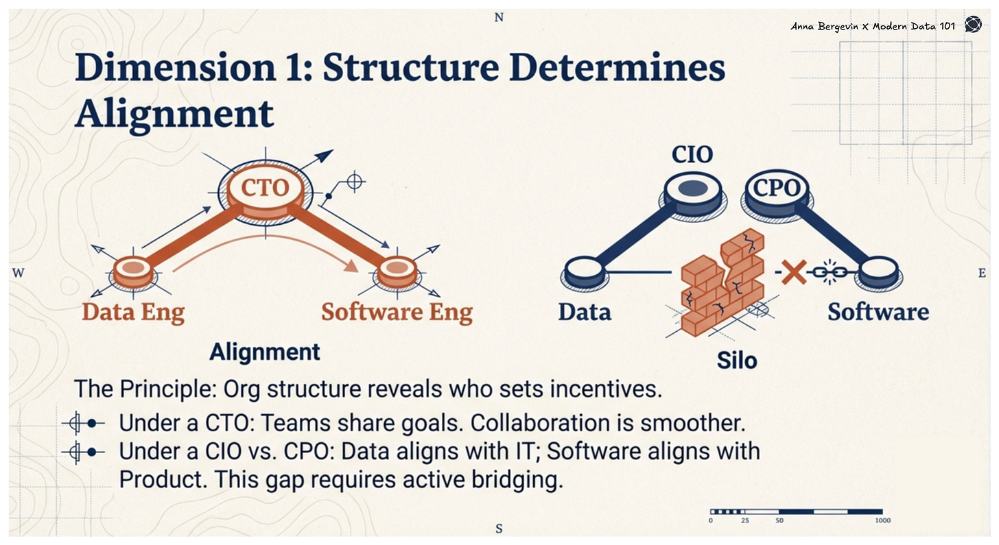 These mappings uncover how the organization thinks about each group. I’ve worked on data teams under both a CTO and a CIO. Under the CTO, all of engineering (software, enterprise applications, data) shared the same org and goals.