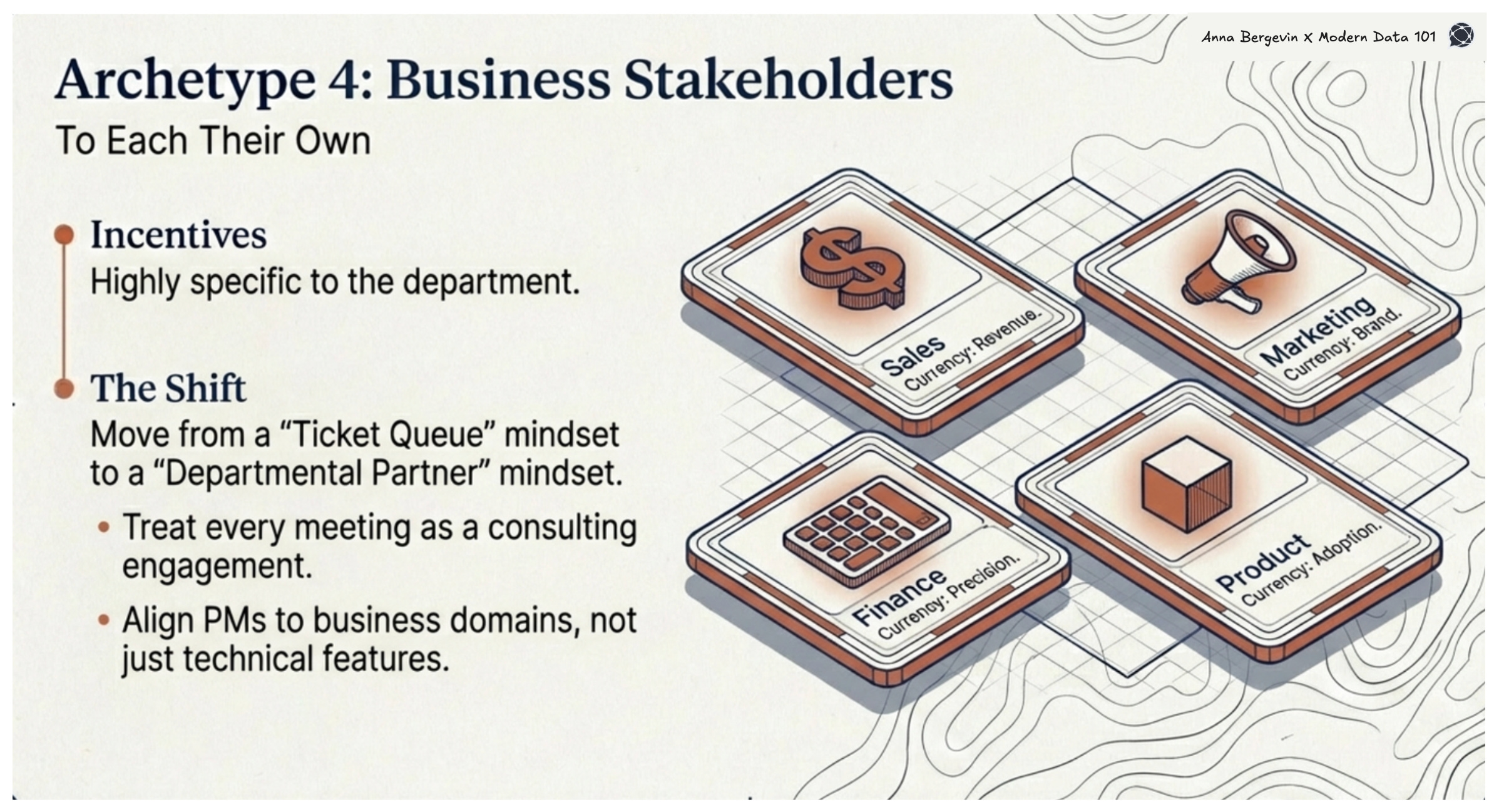 Data Platform PMs limit their impact when they treat business stakeholders as a homogeneous group or just respond to inbound requests. Wrong. Every meeting is a consulting engagement: get up to speed fast, find opportunities, solve together. Hear requests but also help them think bigger about data & AI’s role in their department.