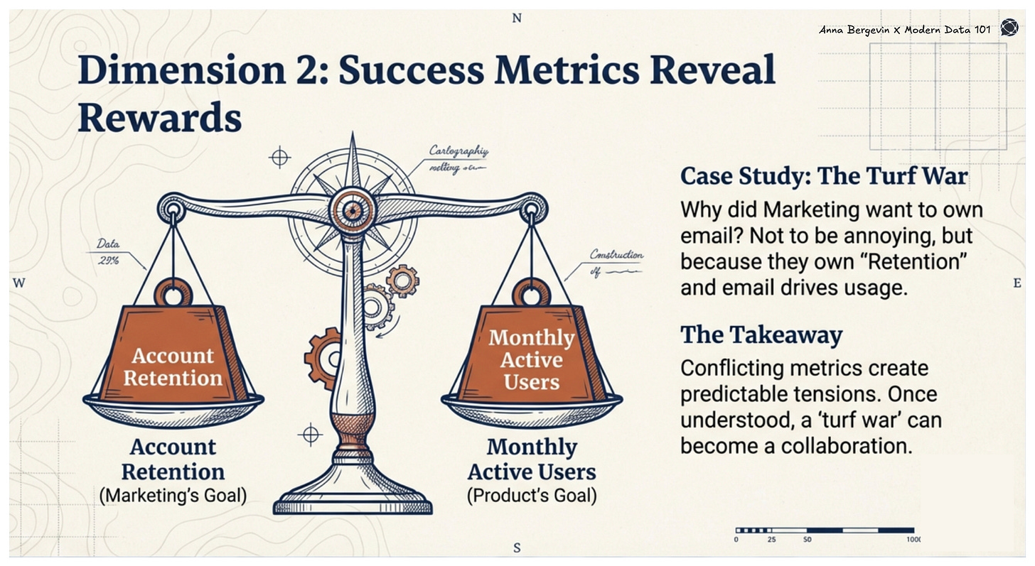 Understanding the org structure tells you who sets incentives. Understanding success metrics tells you what those incentives actually reward. What are the called-out KPIs for different teams? Is there clarity or ambiguity? Do some people feel pulled in conflicting directions? Are individual performance measures aligned with team goals, or are they at odds?