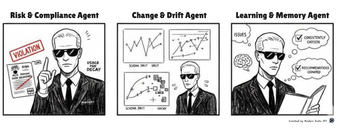 If schema changes invalidate a downstream model or usage drops sharply, this agent dials down confidence scores/ranks automatically.