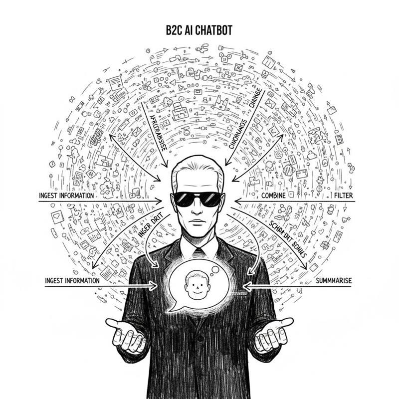 B2C AI chatbots are built to thrive in exactly this environment. At their core, they function as extraordinarily sophisticated search engines: systems that ingest the vast expanse of publicly available information and learn how to combine, filter, compress, and summarise it in a way that aligns with the user’s intent.