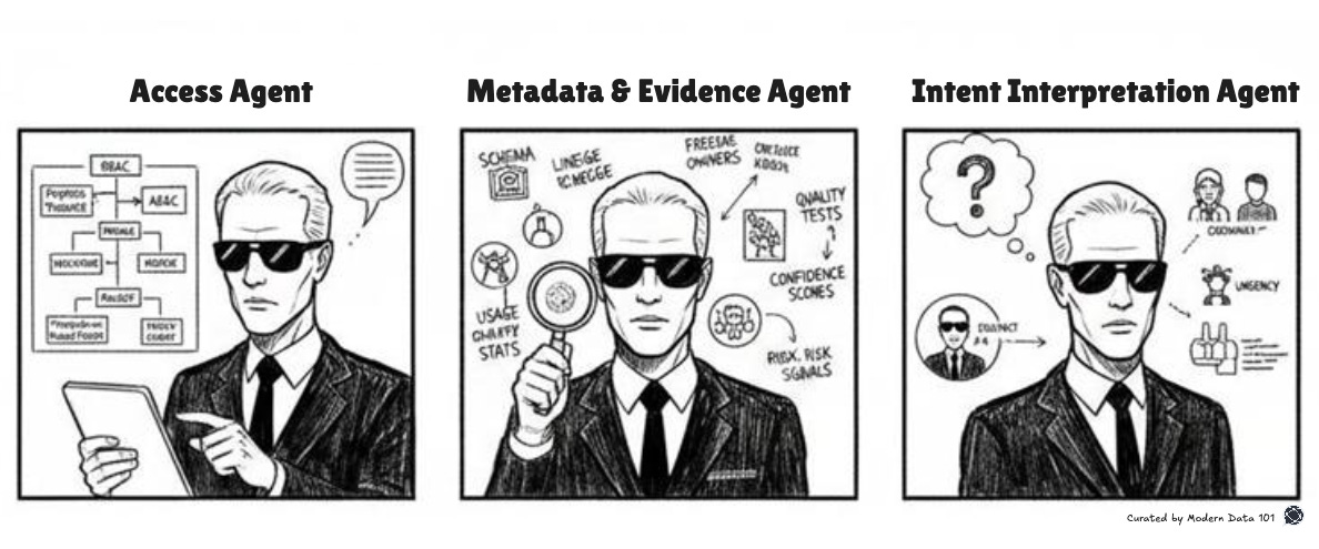 Consider a user asking, “What customer revenue data can I use for churn modelling?” Before intent is interpreted or metadata is explored, the system must resolve whether the user can access raw customer-level financial data, only aggregated metrics, or nothing at all. This agent reads RBAC/ABAC rules, purpose constraints, and data contracts, and produces a filtered worldview of permissible assets.