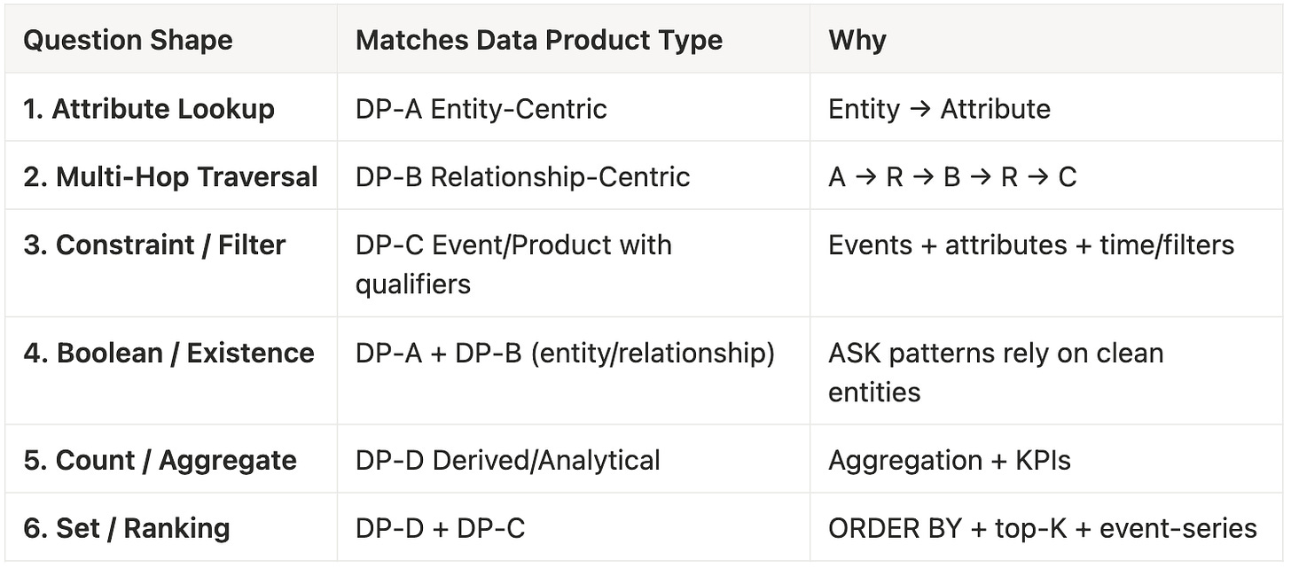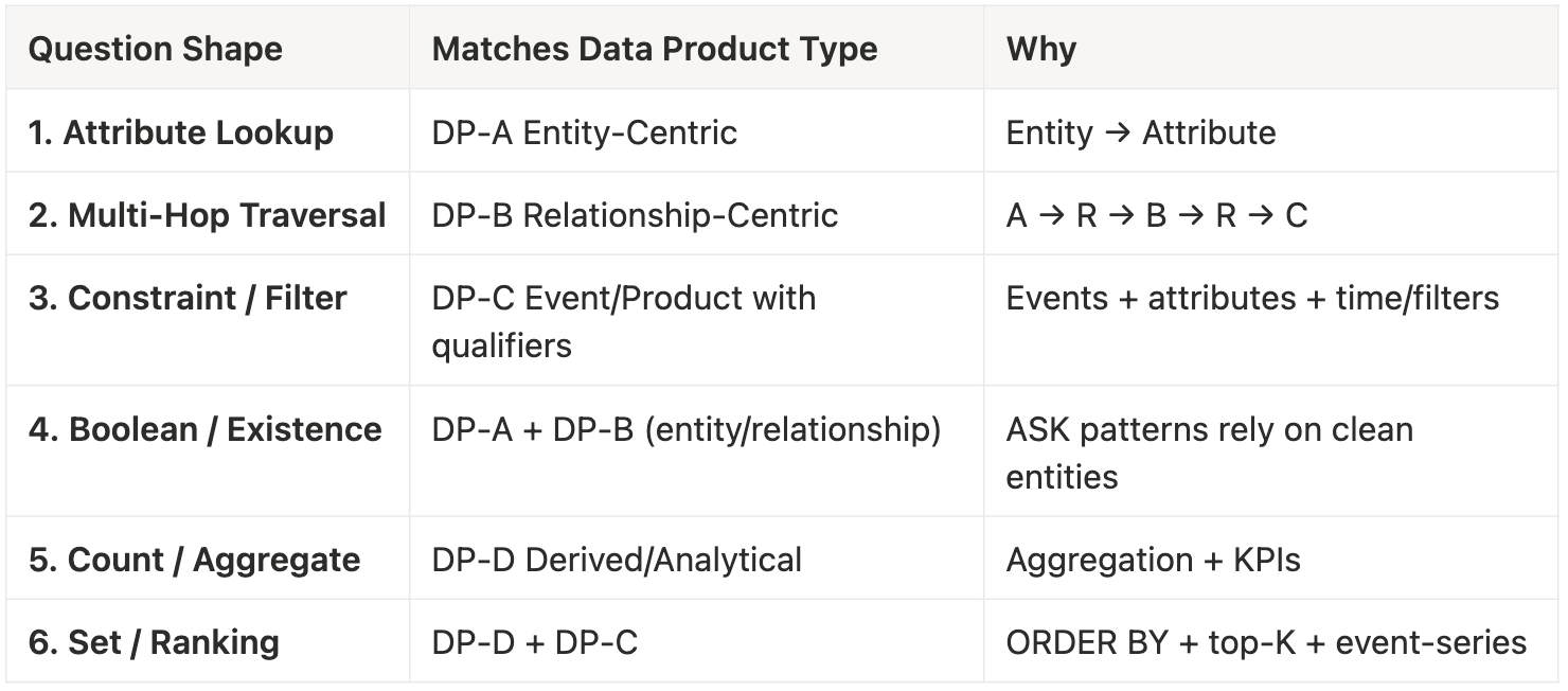 This mapping maintains high fidelity to the real knowledge landscape. For each question shape, the corresponding Data Product template provides the data structure that the question shape requires.