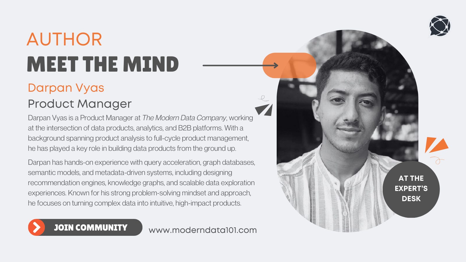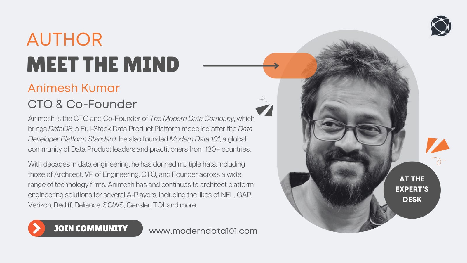 Discuss shared technologies and ideas by connecting with our Authors or directly dropping us queries on community@moderndata101.com
