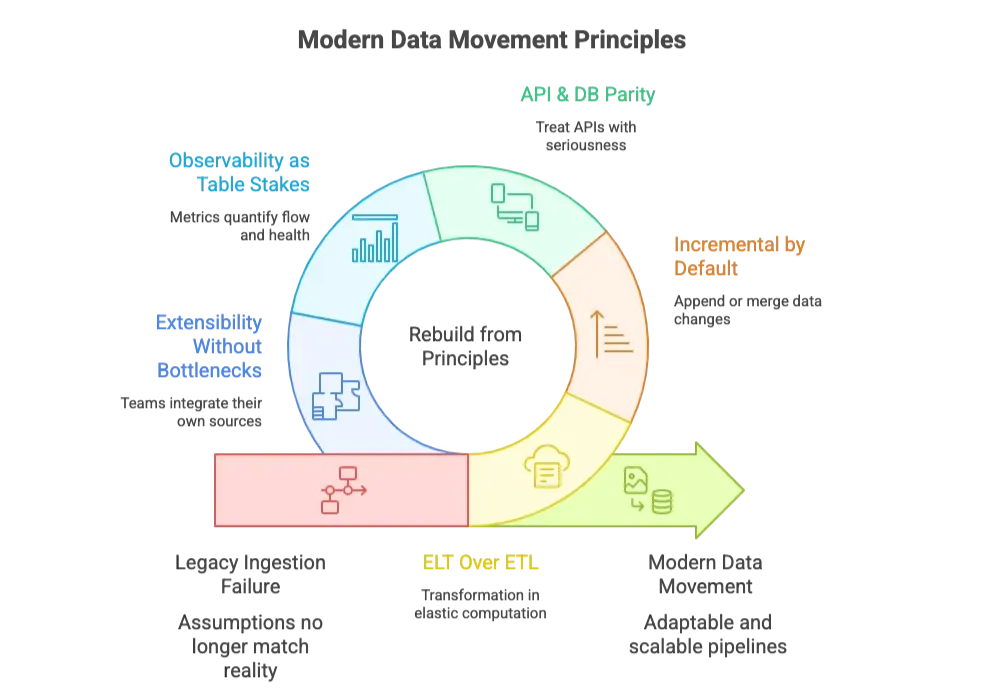 Modern data movement starts from fundamentals: only move what has changed, capture deltas with precision, treat APIs as first-class citizens, and make every pipeline measurable and accountable. Observability isn’t optional but baked into the fabric of the system.