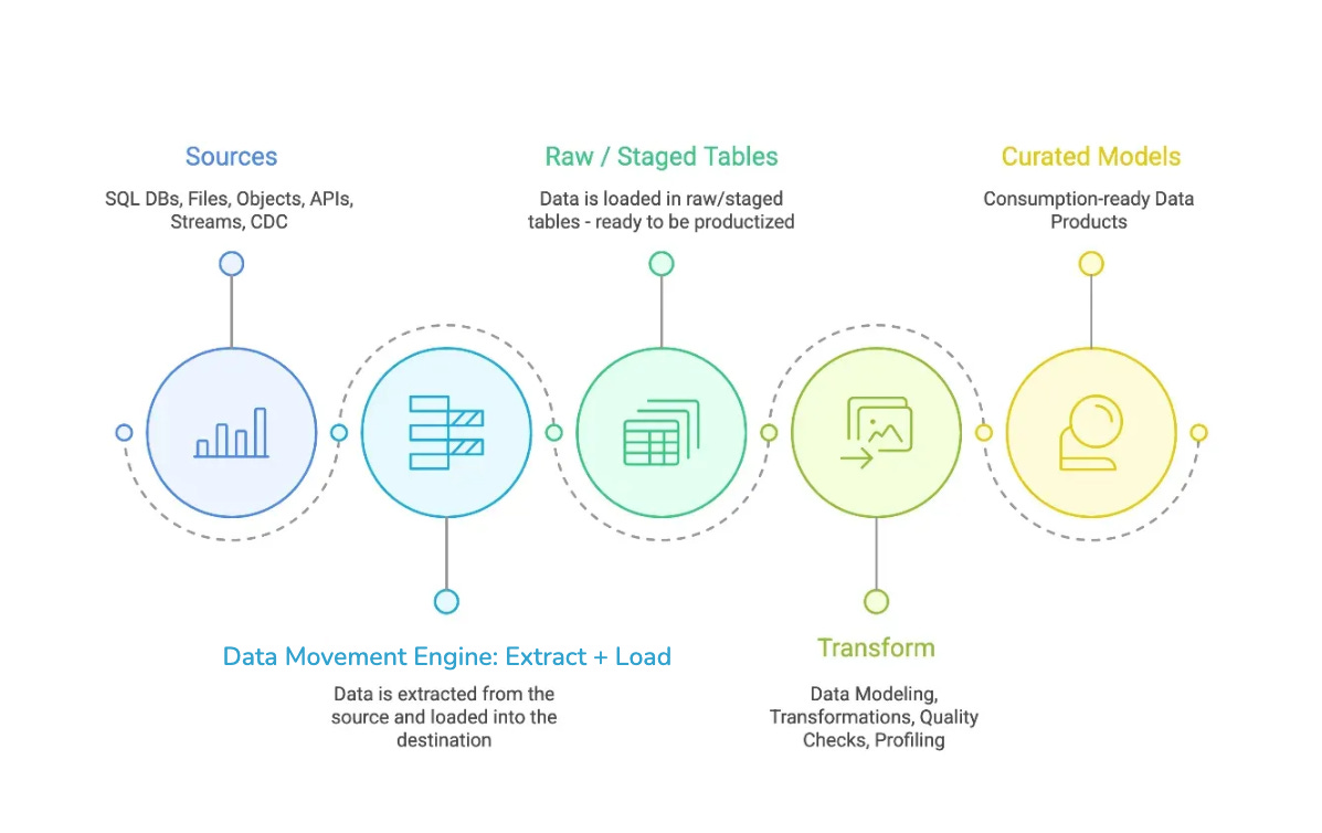 E+L purity by design for scalable data ingestion: Keep Extract + Load lean; push transformations downstream to MPP/lakehouse engines for agility and operational simplicity.