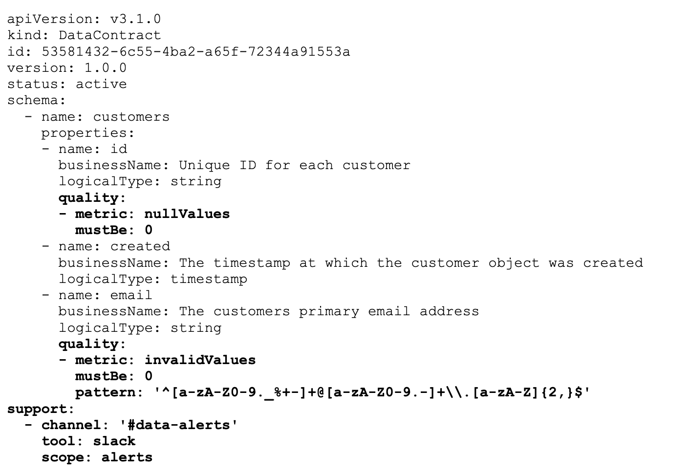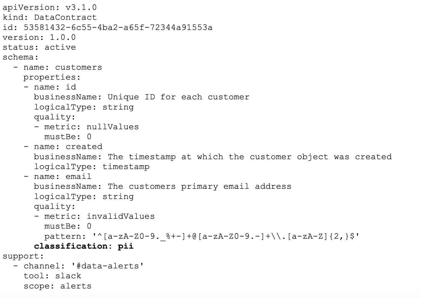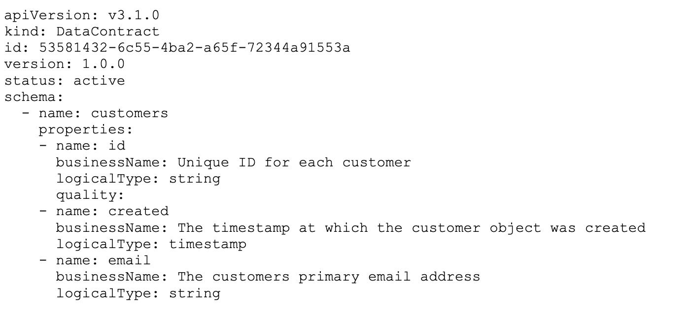 For the purposes of this example, here’s a minimal data contract defined in YAML following the ODCS: