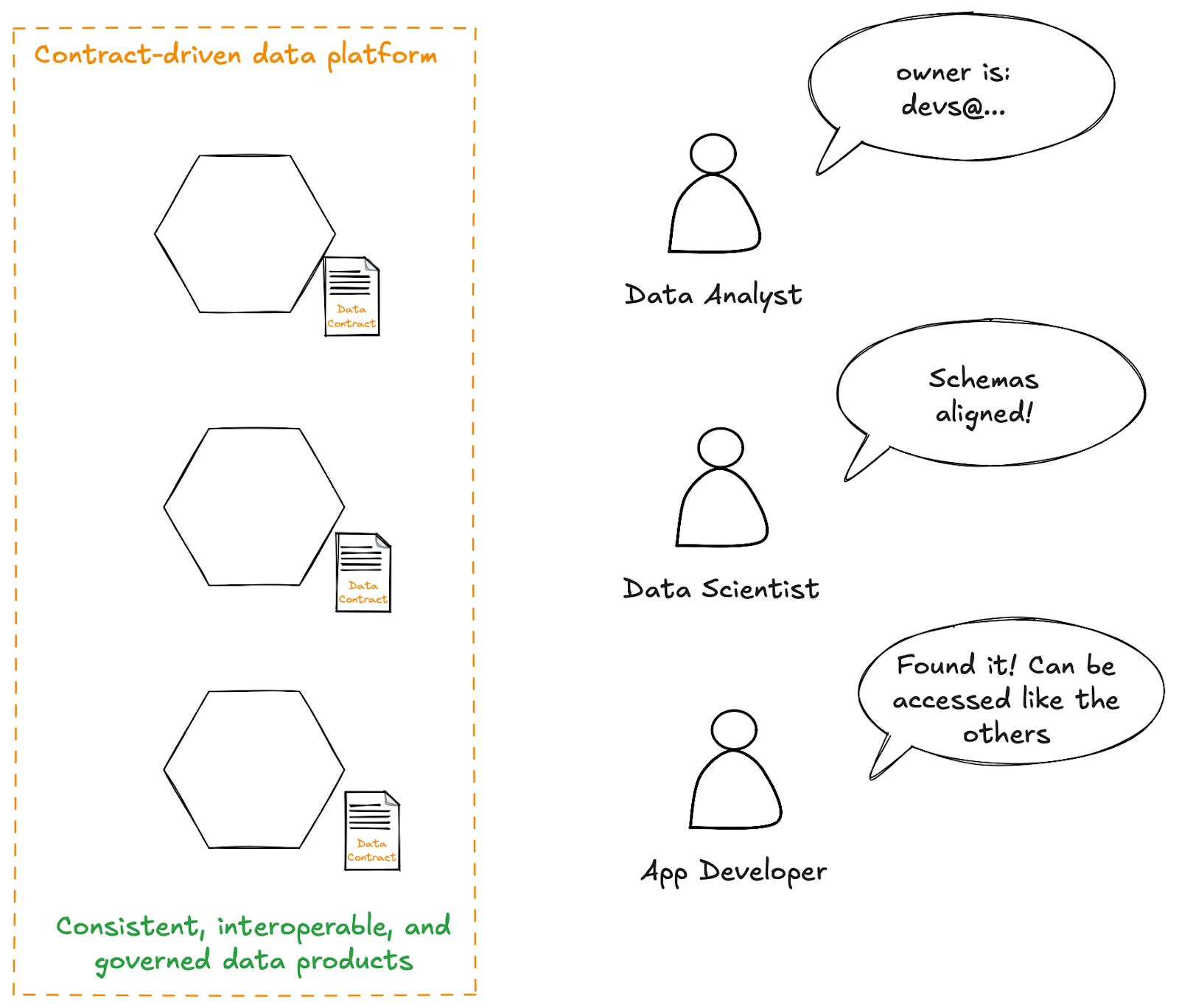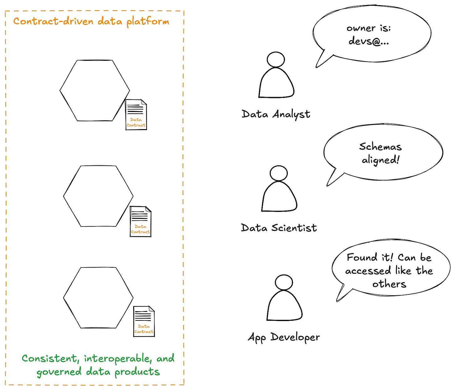 Every data consumer knows how to discover data that is managed through a contract-driven data platform. They know how to look up the expectations around that data, and how to find its owner. They know how the access controls are set up, and how to ask for the permissions they need.