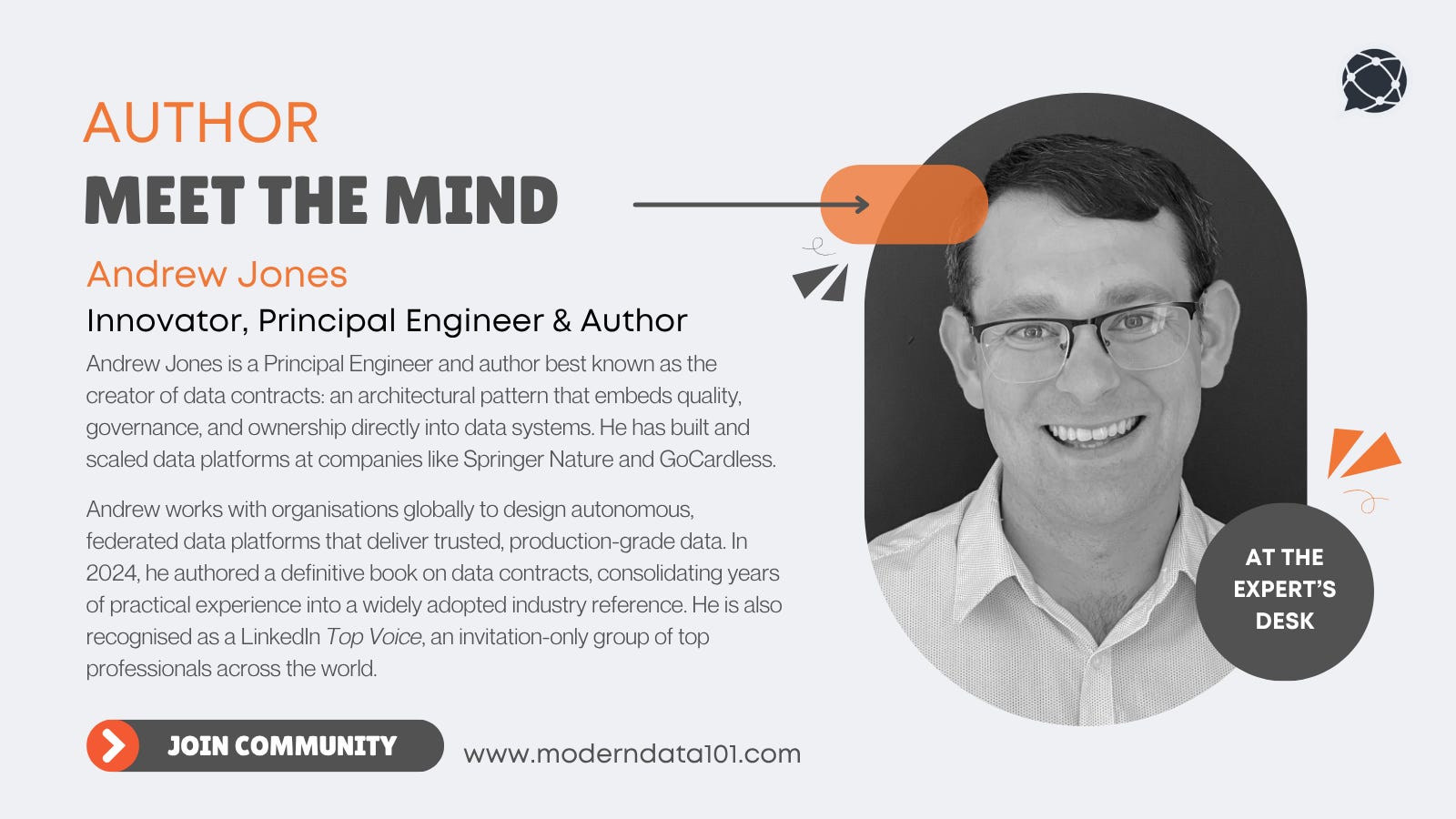 Andrew Jones is a Principal Engineer and Author, specialising in modern data architecture and platform design. He is widely recognised as the creator of data contracts, an approach introduced in 2021 that redefines how organisations manage data quality, ownership, and governance by treating data as a product with explicit, enforceable interfaces. He is also part of the LinkedIn Top Voices recognition, an invitation-only group of experts across the professional world.