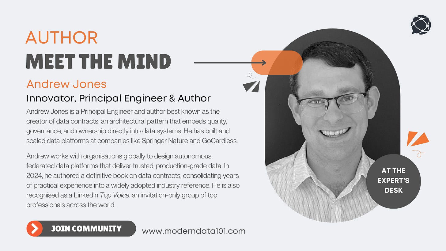 In 2024, he authored a definitive book on data contracts, consolidating years of practical experience into a widely adopted industry reference. Beyond his technical work, Andrew is an active contributor to the data community, a member of Google Developer Experts, and part of the technical steering committee for Bitol, helping shape open standards for data contracts and data products. We’re honoured to feature his insights on Modern Data 101.
