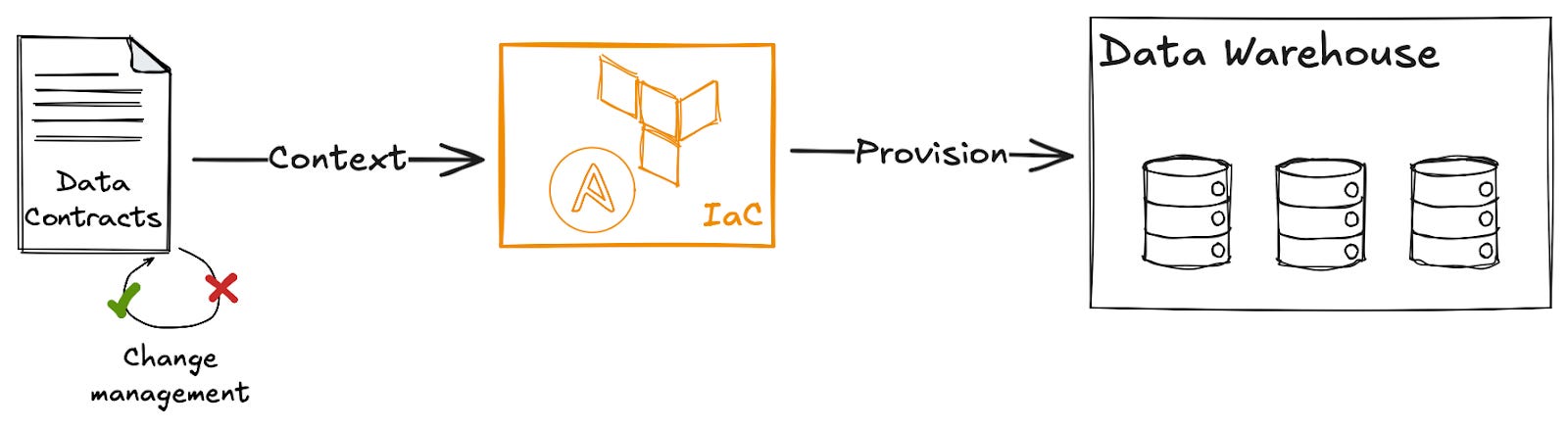 Firstly, we can use this data contract to provision a table in the data warehouse by simply taking the data contract, converting it into a format understood by our infrastructure as code platform (Terraform, Pulumi, etc), and having it manage this table.
