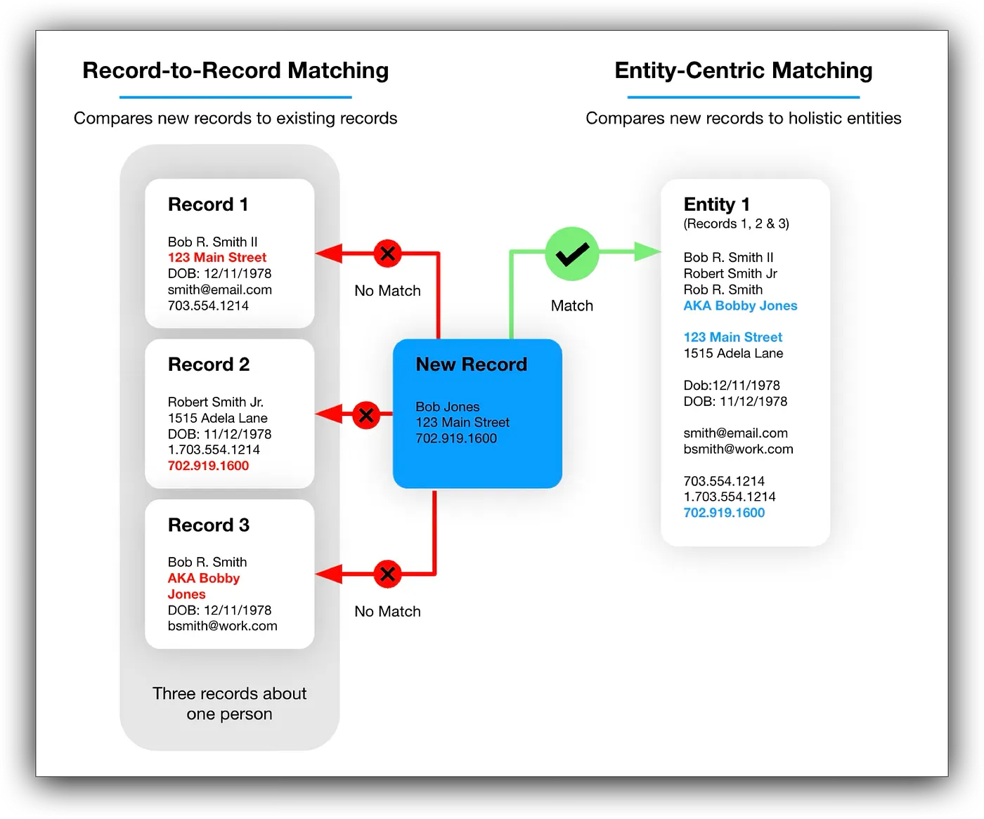 When entity resolution operates without our work, results remain technically useful but semantically isolated. The output captures what matches, but not why it matters. Two records merge because phone numbers align,