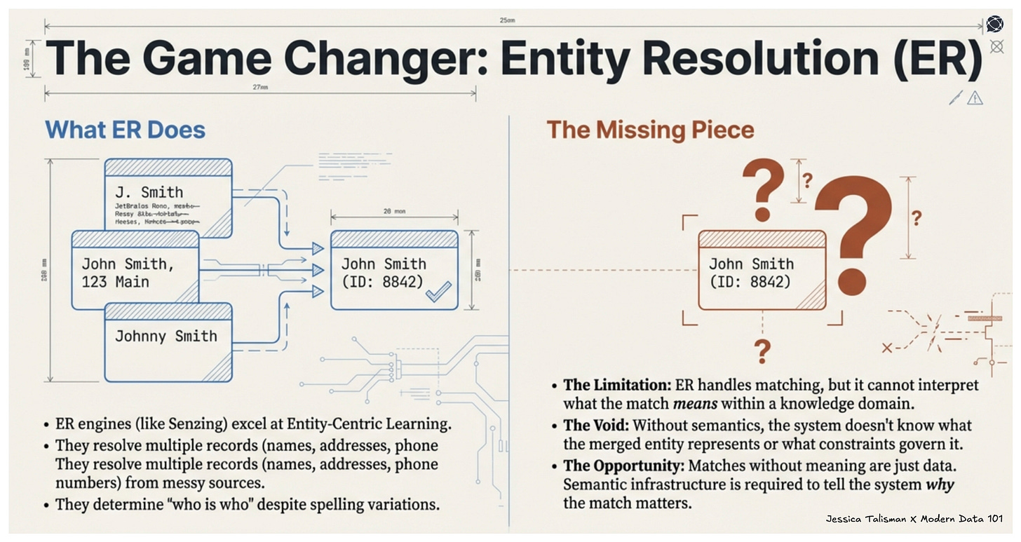 Entity resolution produces candidate matches. But as ontologists and semantic engineers know all too well, the semantic infrastructure determines what those matches mean.