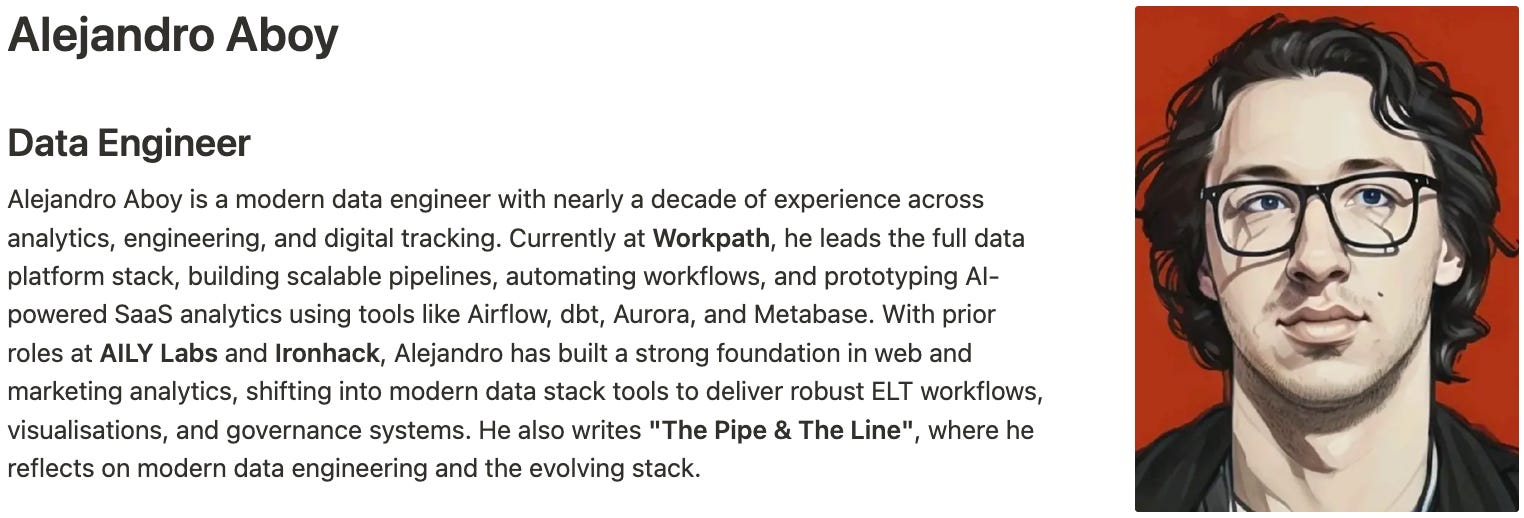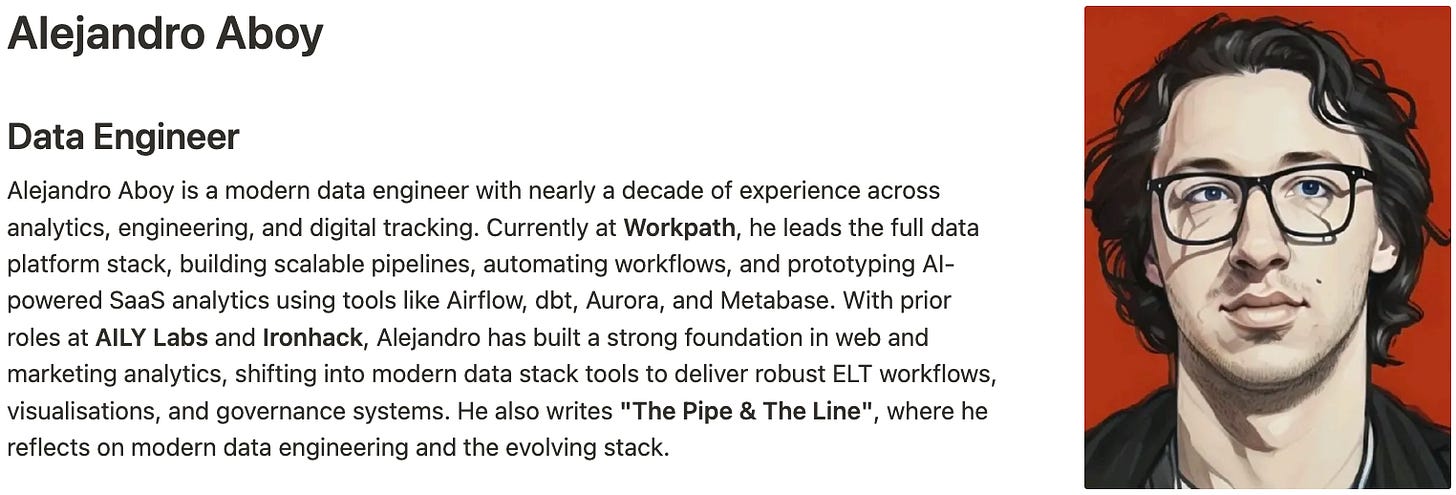 This piece is a community contribution from Alejandro Aboy, a data engineer with nearly a decade of experience across analytics, engineering, and digital tracking. Currently at Workpath, he is the main data platform stack owner, building scalable pipelines, automating workflows, and prototyping AI-powered SaaS analytics using tools like Airflow, dbt, Aurora, and Metabase. With prior roles at AILY Labs and Ironhack, Alejandro has built a strong foundation in web and marketing analytics, shifting into modern data stack tools to deliver robust ELT workflows, visualisations, and governance systems. He also writes The Pipe & The Line, where he reflects on modern data engineering and the evolving stack. We’re thrilled to feature their unique insights on Modern Data 101!