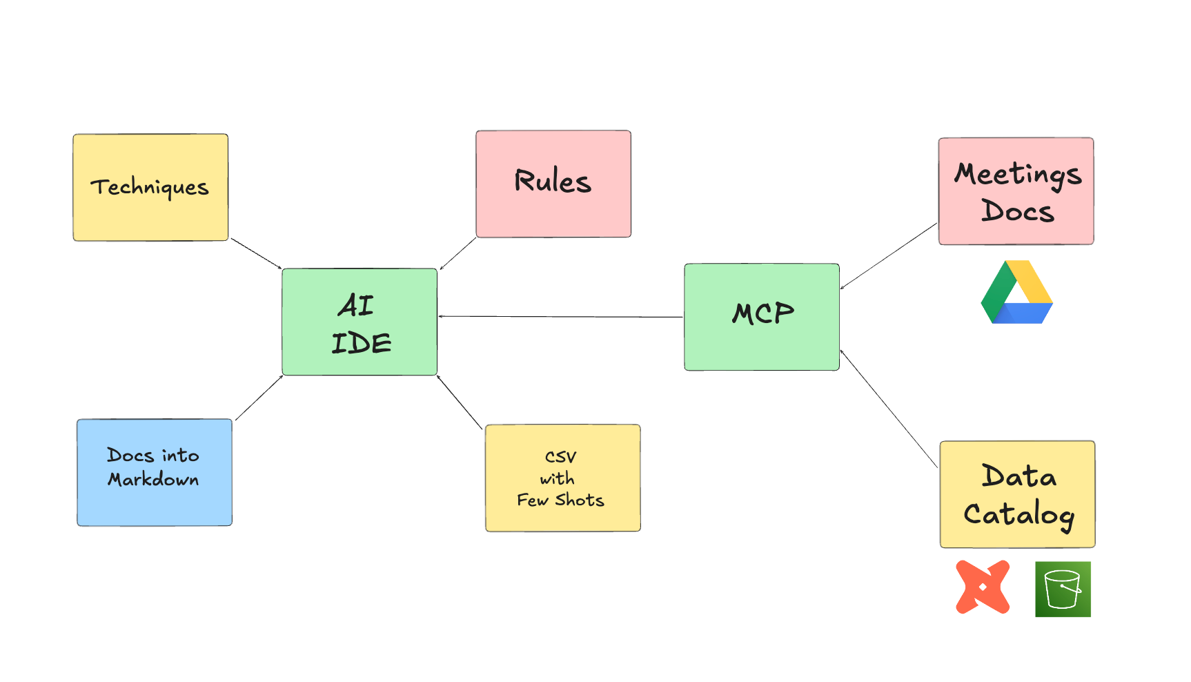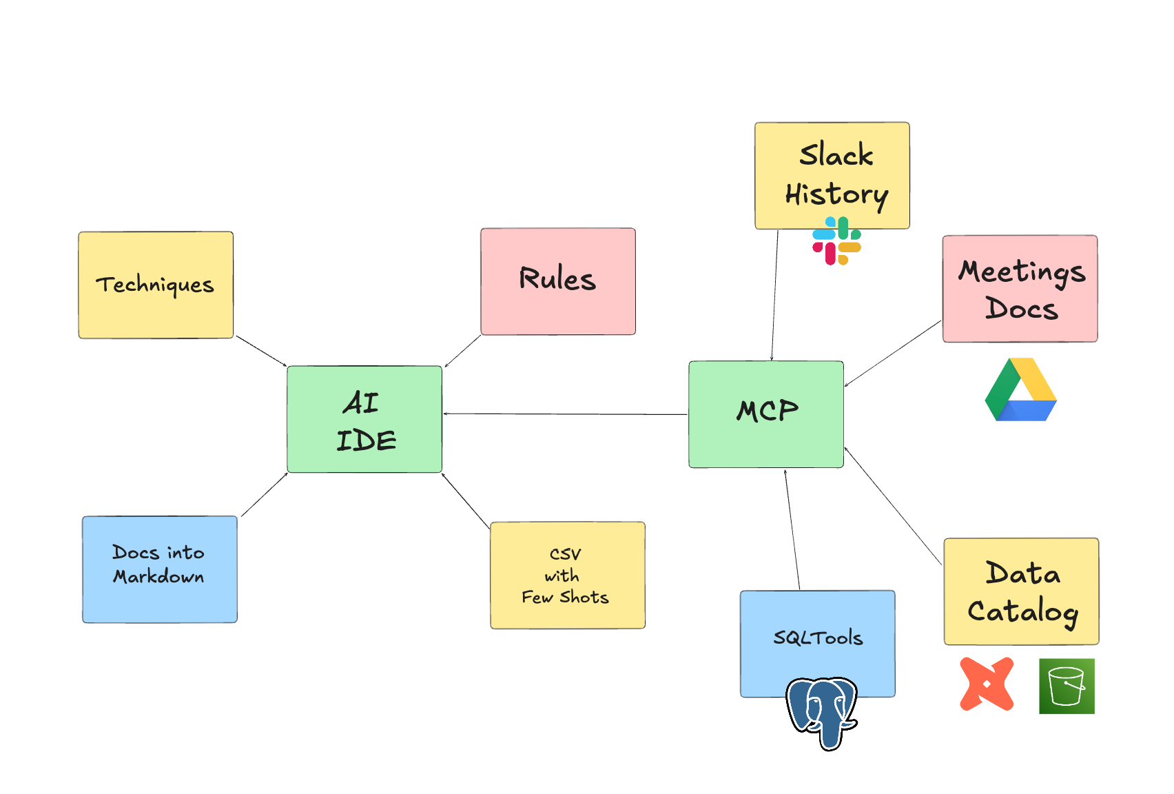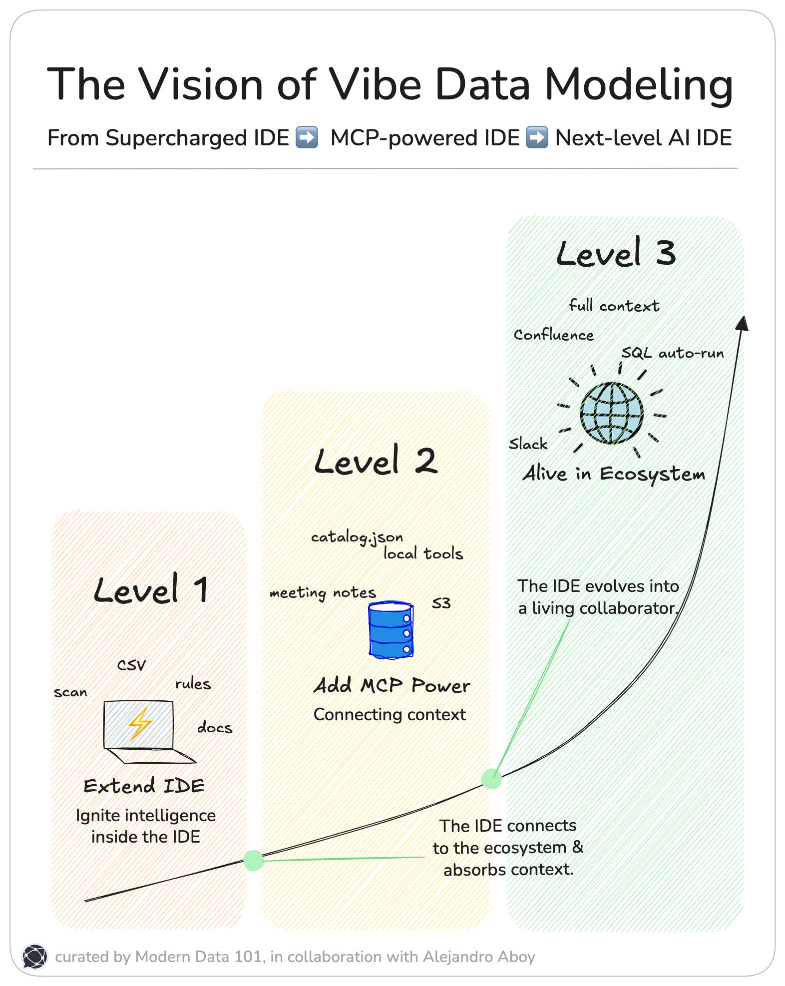 On Levels 1 and 2, your AI IDE can pick up your meeting documents from a Drive folder, expose your data catalog to the server to check any nuances, and start modeling by scanning all dependencies perfectly.